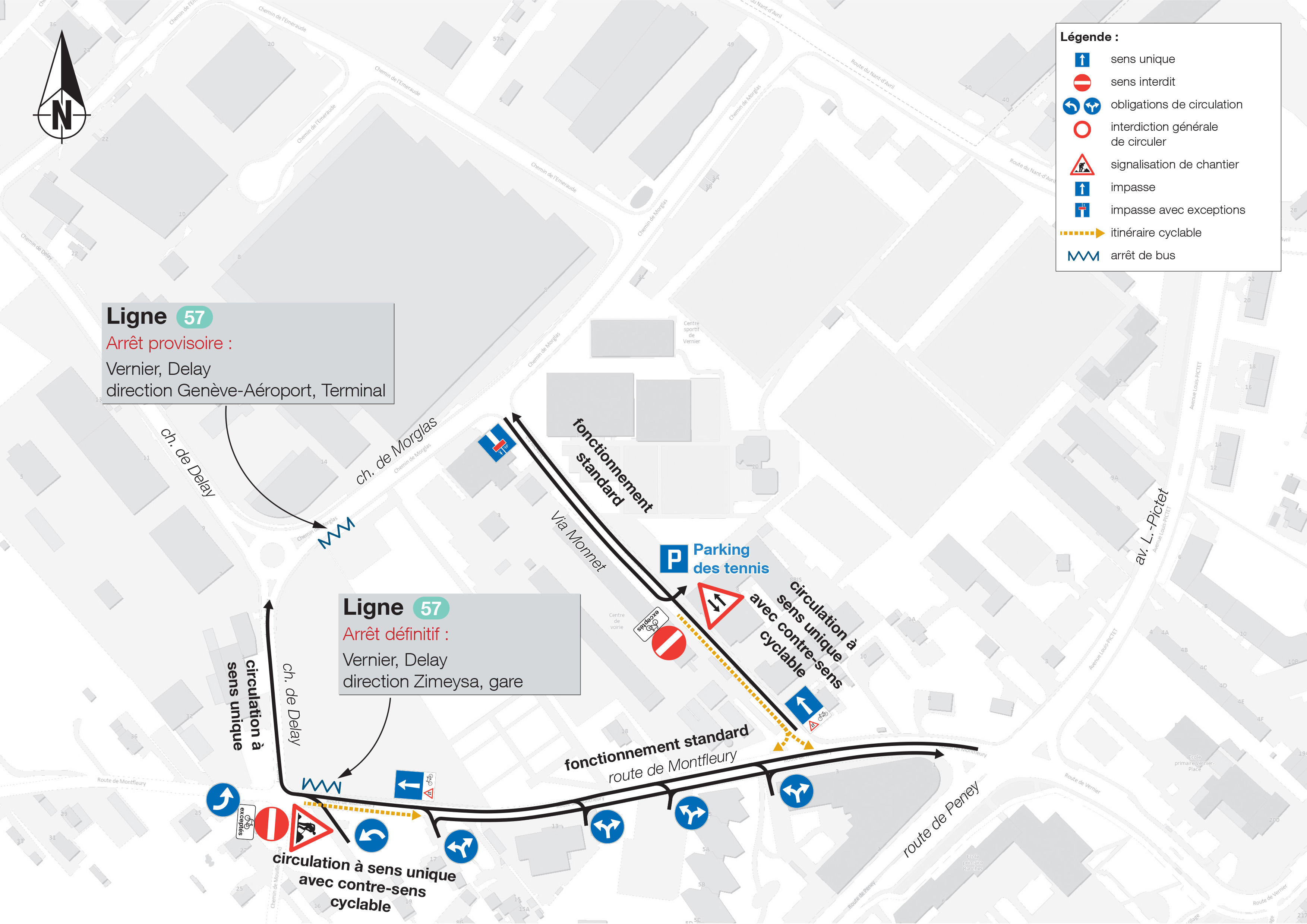 Dès le 6 octobre 2025 durant 2 semaines, Via Monnet sera mise en impasse en direction de la route de Montfleury. La ligne 57 reste déviée par l'avenue Louis-Pictet et la route du Nant-d’Avril, et la circulation est maintenue à sens unique sur la route de Montfleury.