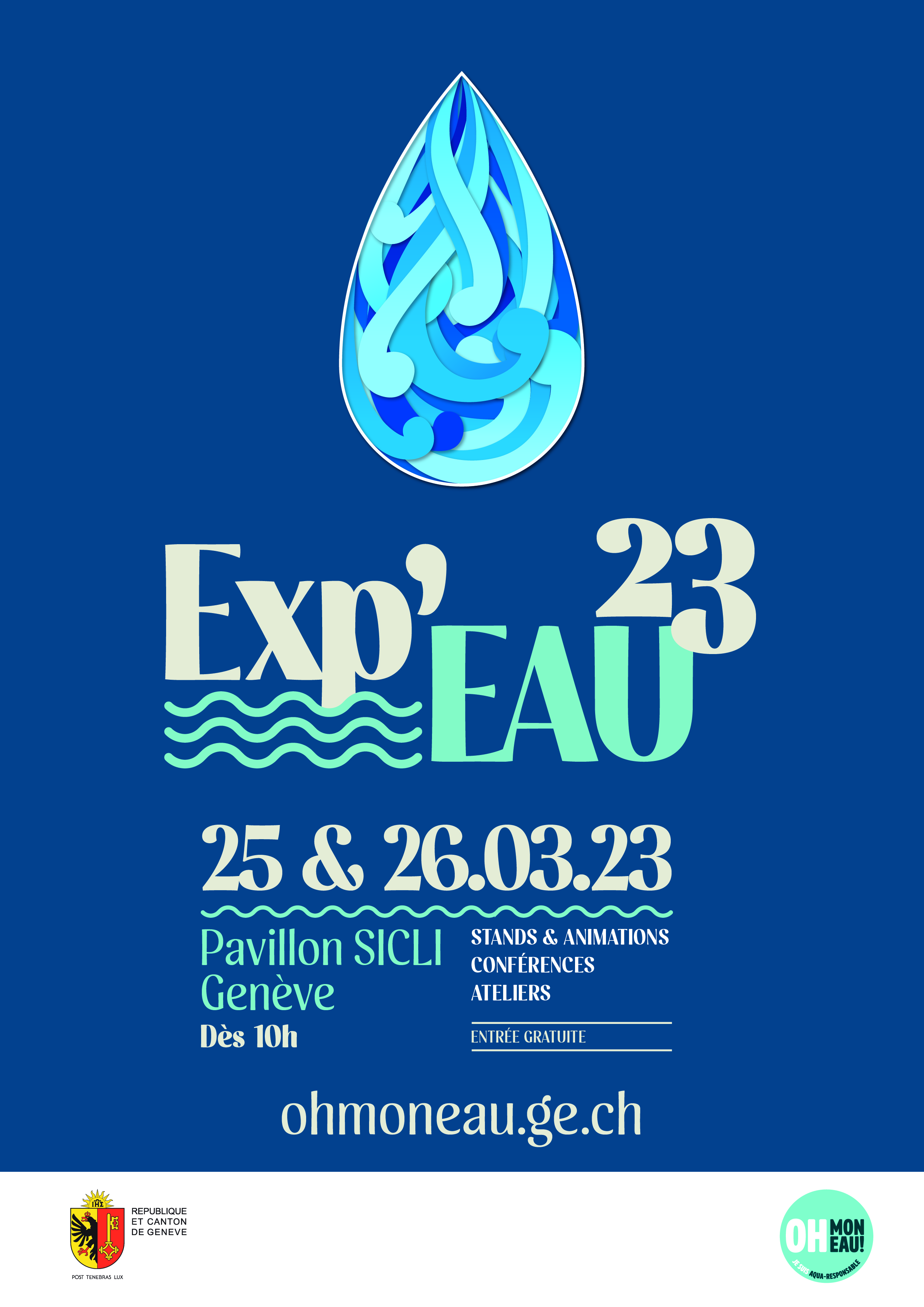 Affiche qui peut être téléchargée et imprimée pour annoncer l'événement exp'EAU 23 ayant lieu les 25 et 26 mars 2023 au pavillon SICLI, dans le cadre de la 30ème journée mondiale de l'eau.