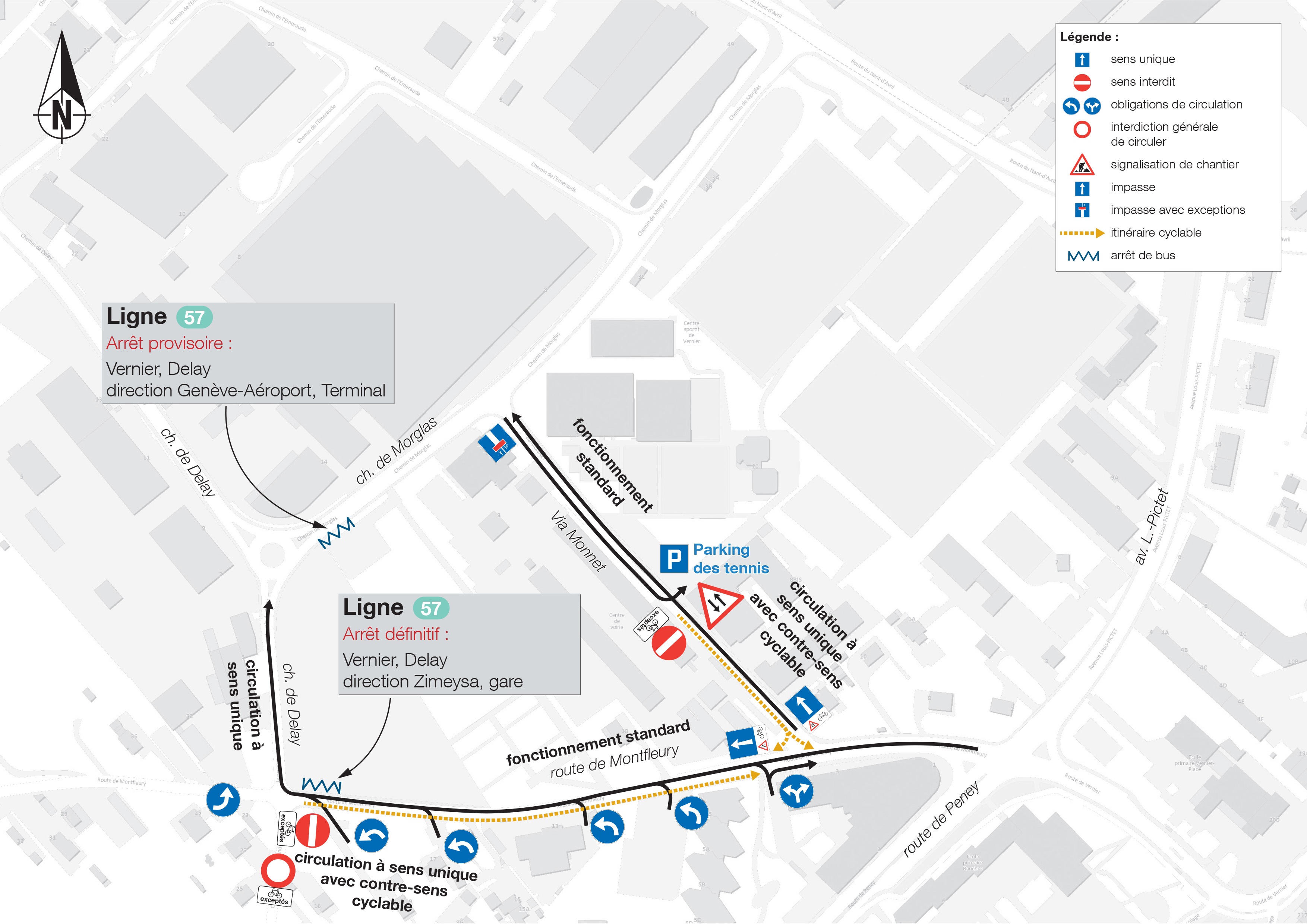 - Reprise de la circulation à double sens sur le tronçon de Via-Monnet entre le parking des tennis et le chemin de Morglas.