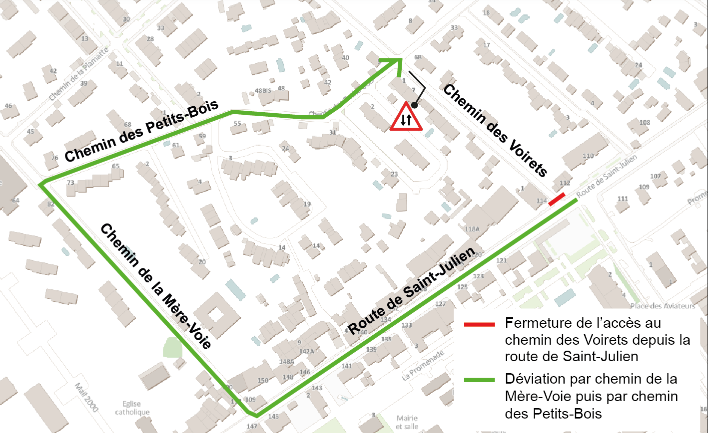 - Fermeture de l'accès au chemin des Voirets depuis la route de Saint-Julien. Déviation par la route de Saint-Julien, le chemin de la Mère-Voie puis le chemin des Petits-Bois.