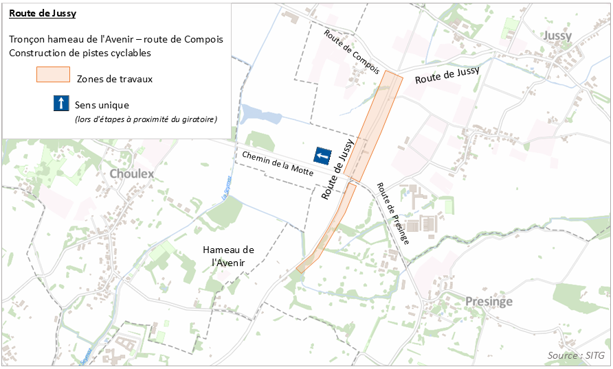Route de Jussy, depuis la sortie du hameau de l'Avenir jusqu'au giratoire avec la route de Compois
