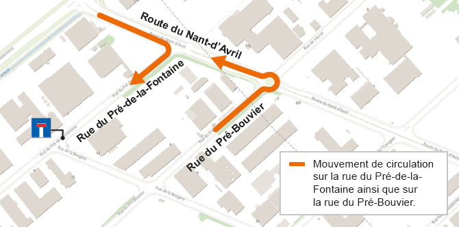 - Mise en sens unique de la rue du Pré-Bouvier en direction de la route du Nant-d’Avril.