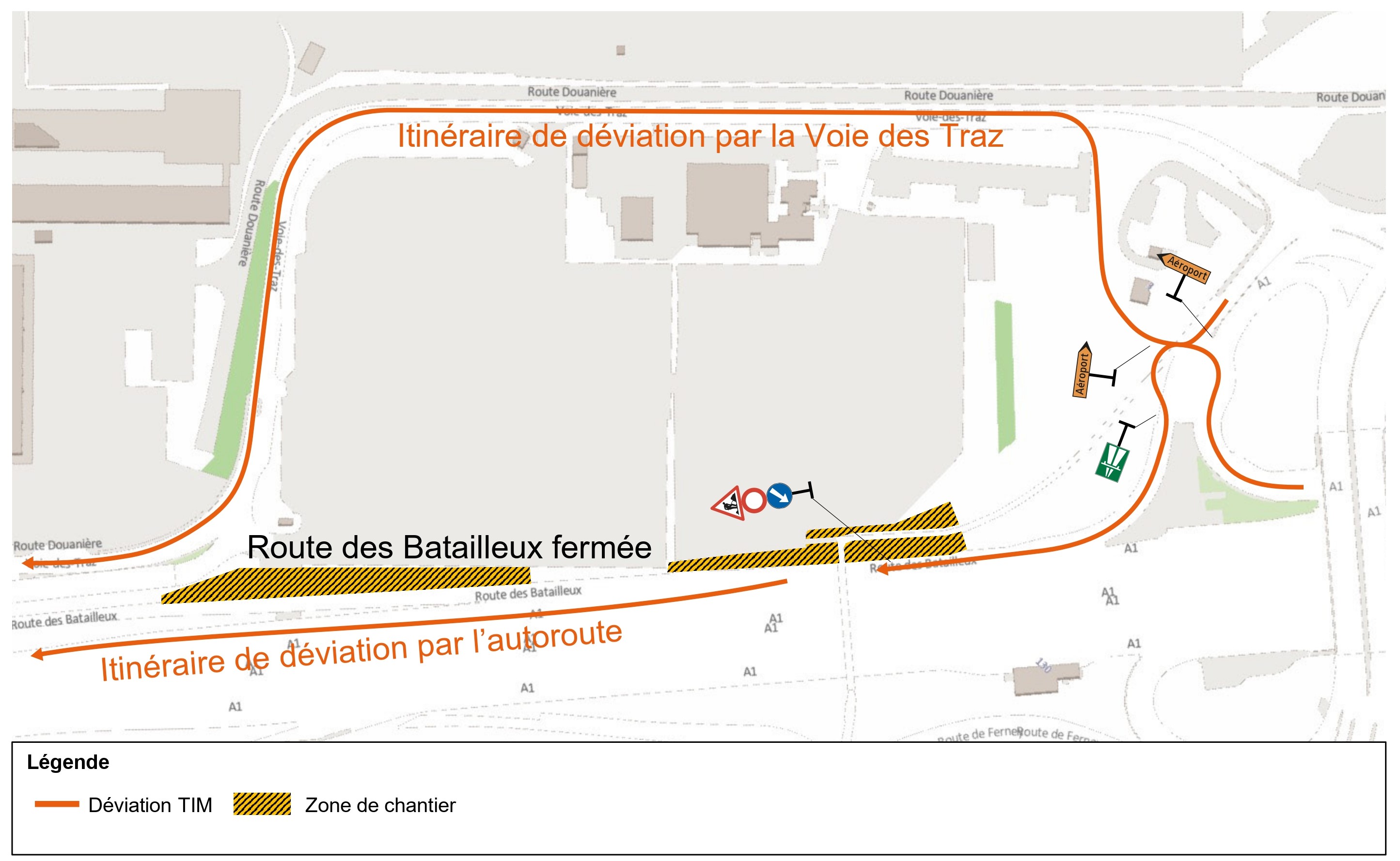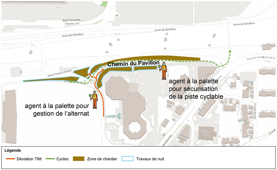 - Contreroute d'accès : circulation alternée gérée par des ouvriers à la palette. Fermeture de la voie entrant sur le chemin du Pavillon, avec gestion du trafic entrant / sortant par des agents à la palette depuis la voie sortante du chemin du Pavillon