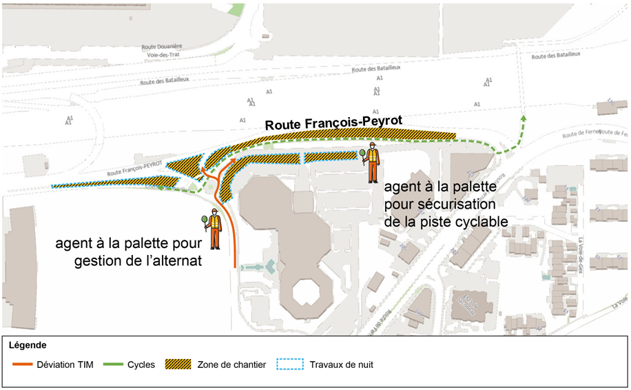- Route François-Peyrot : entre l'entrée de l'autoroute N01 et la route de Ferney