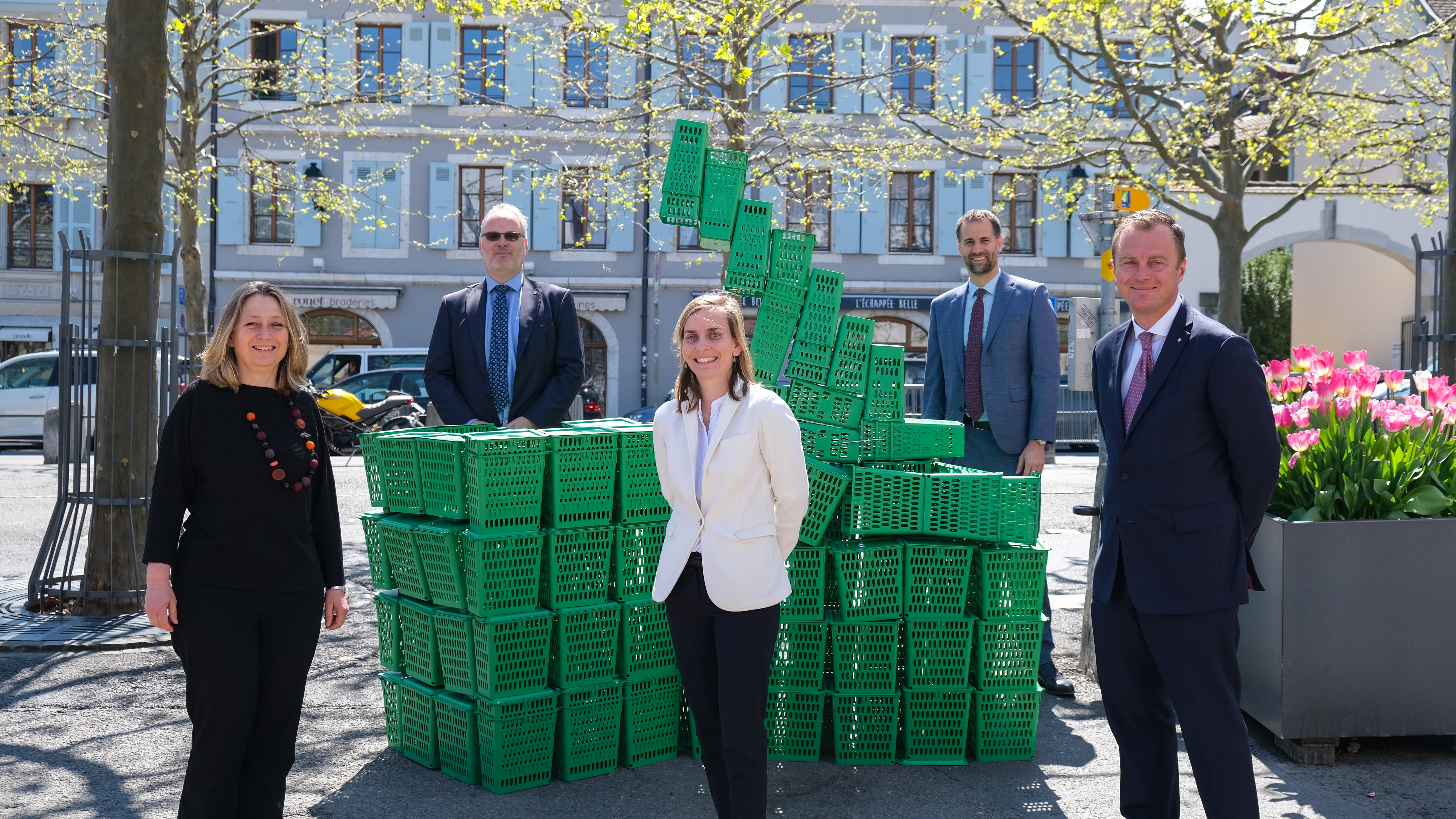 Légende pour la photo du lancement de la campagne en présence des autorités, de gauche à droite : Mme Sonja Molinari, conseillère administrative, Ville de Carouge; M. Laurent Tremblet, conseiller administratif, Ville de Meyrin; Mme Marie Barbey-Chappuis, conseillère administrative, Ville de Genève; M. Antonio Hodgers, conseiller d'Etat, département du territoire; M. Marc Kilcher, conseiller administratif, Ville de Thônex.
