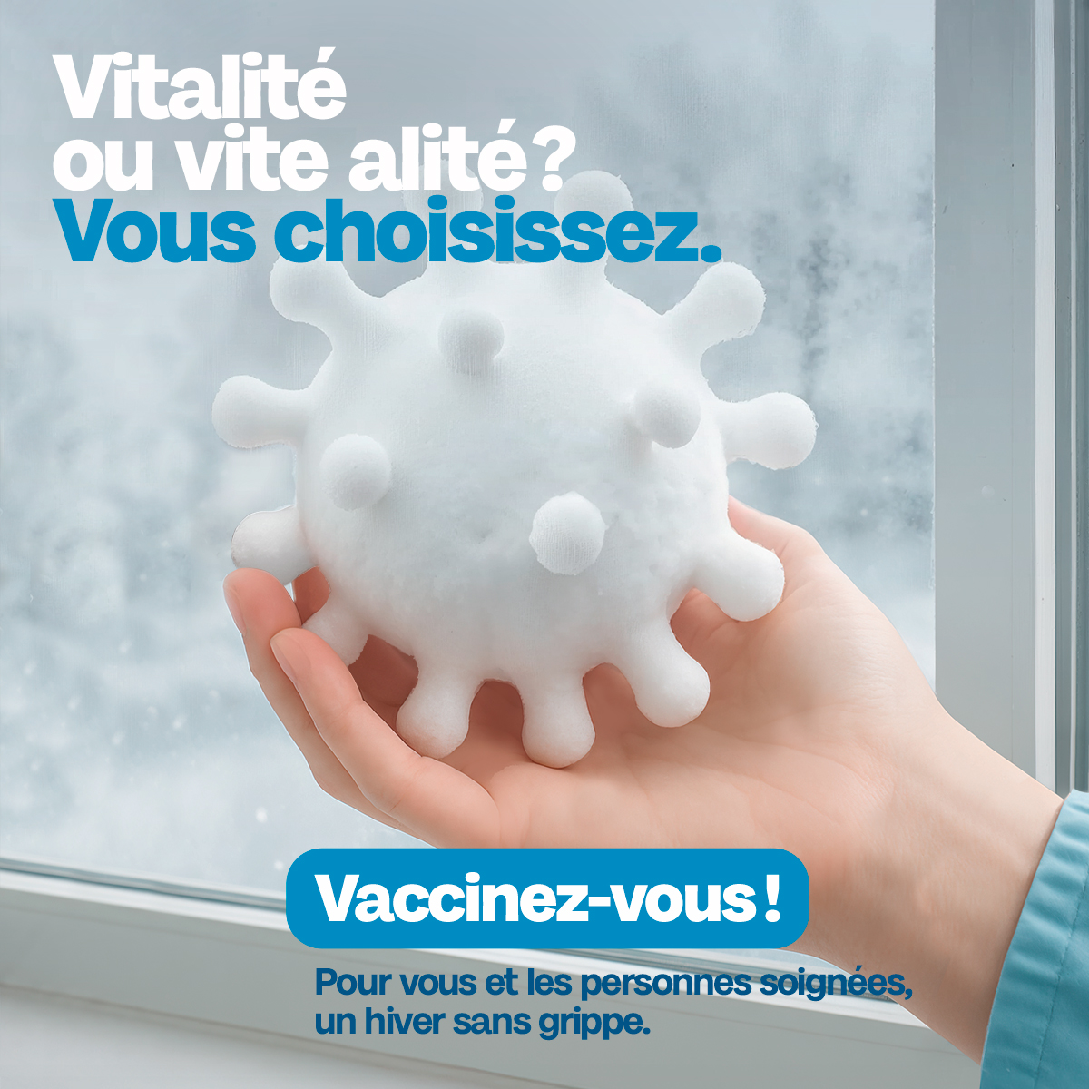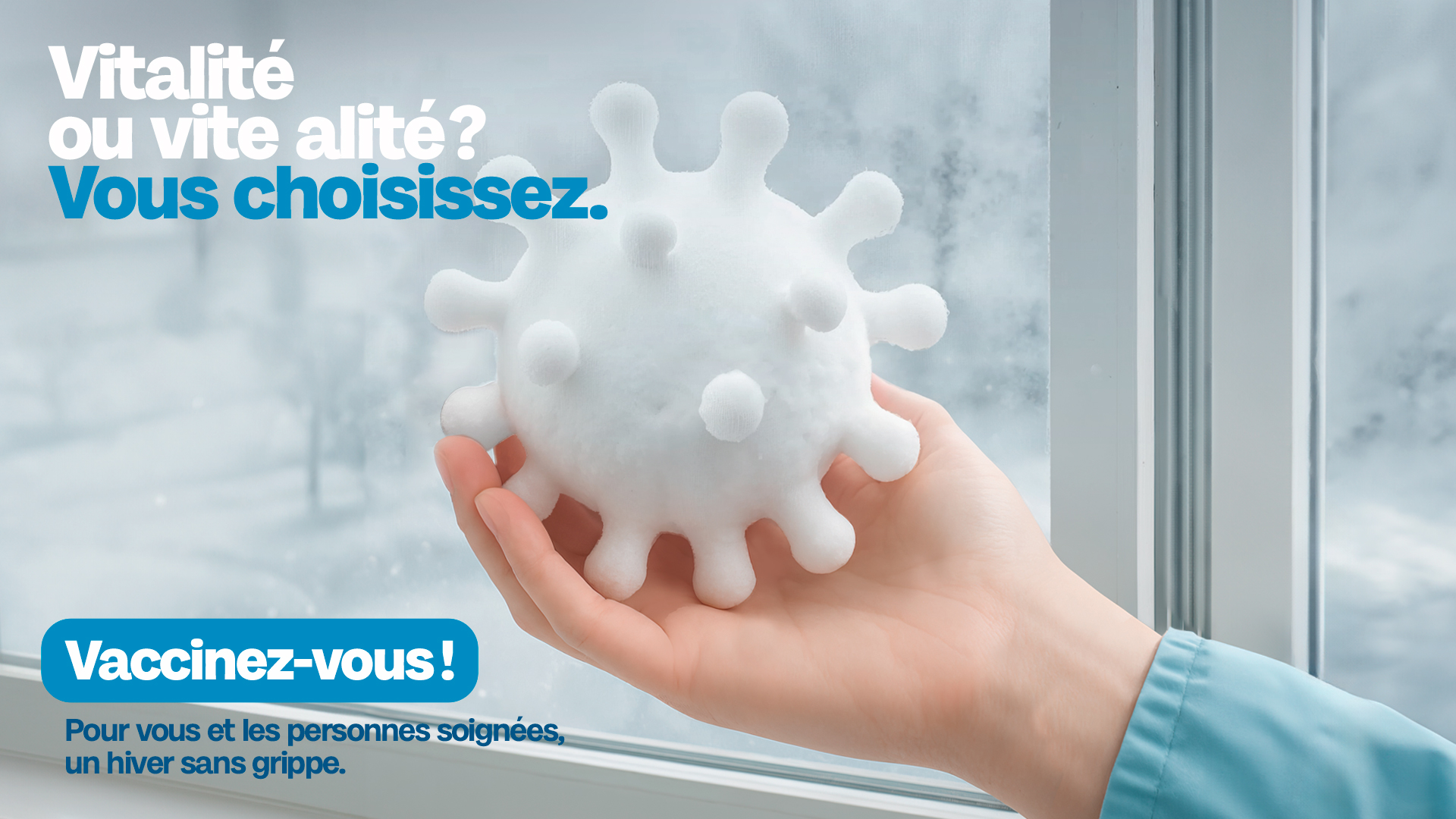 Cette affiche à destination des institutions de soins porte un message de promotion de la vaccination contre la grippe chez le personnel en contact avec des personnes soignées. Elle est proposée dans différents formats selon les besoins: possibilité d'insérer le logo de votre institution et diffusion sur vos sites internet.