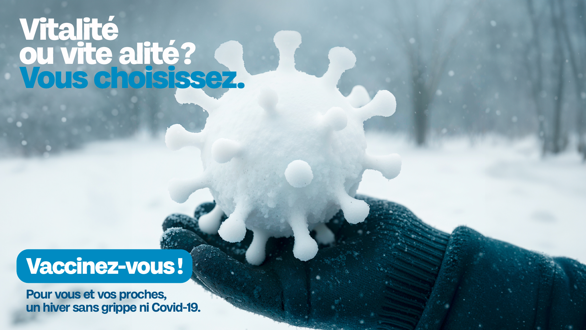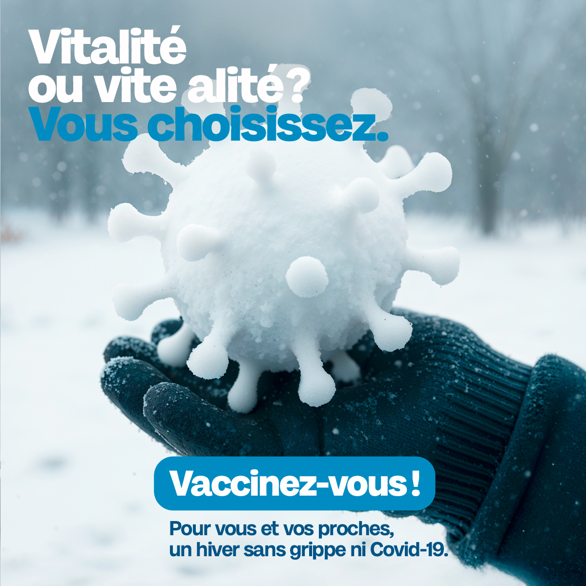 Cette affiche grand public porte un message de promotion de la vaccination contre la grippe et le COVID-19. Elle est proposée dans différents formats selon les besoins: possibilité d'insérer le logo de votre institution, les horaires de vaccination, diffusion sur vos sites internet.
