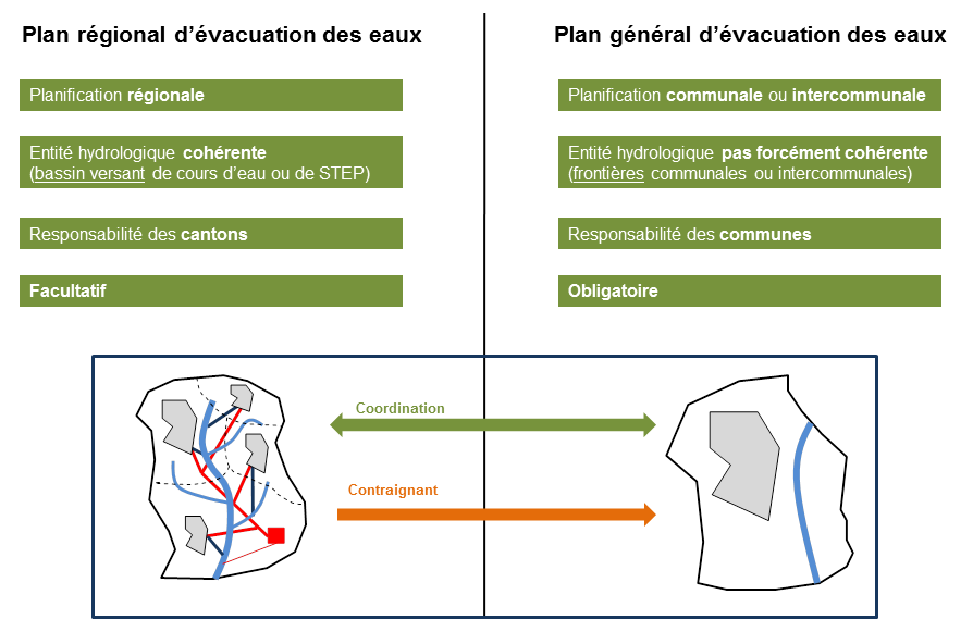 Le plan régional d'évacuation des eaux (PREE) et le plan général d'évacuation des eaux (PGEE) sont des outils de planification de l'assainissement des eaux, c'est à dire de la gestion, de l'évacuation et du traitement des eaux usées et pluviales issues des zones urbanisées. Le PREE est élaboré à l'échelle régionale et le PGEE à l'échelle communale ou intercommunale. Ils présentent un certain nombre de différences et de complémentarités développées dans ce document.