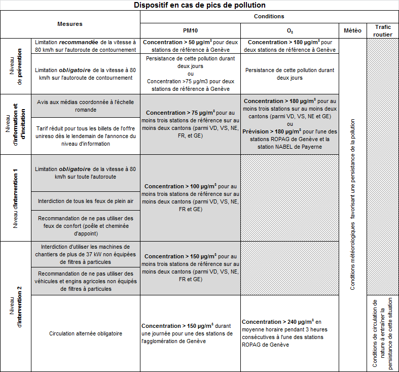 Type de publication Documents d'information Date de publication 26 juin 2018 Auteur Office cantonal de l'environnement (OCEV) Document Dispositif genevois en cas de pic de pollution de l'air Détail Tableau présentant le dispositif en cas de pics de pollution prévoyant une gradation cumulative de mesures. Type de publication Documents d'information Date de publication 26 juin 2018 Auteur Office cantonal de l'environnement (OCEV)