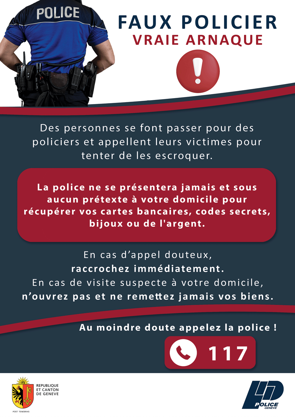 Dans le cadre de la campagne de prévention auprès des seniors contre les arnaques au faux policier, nous vous proposons un visuel à diffuser sur les messageries du type Whats'app.