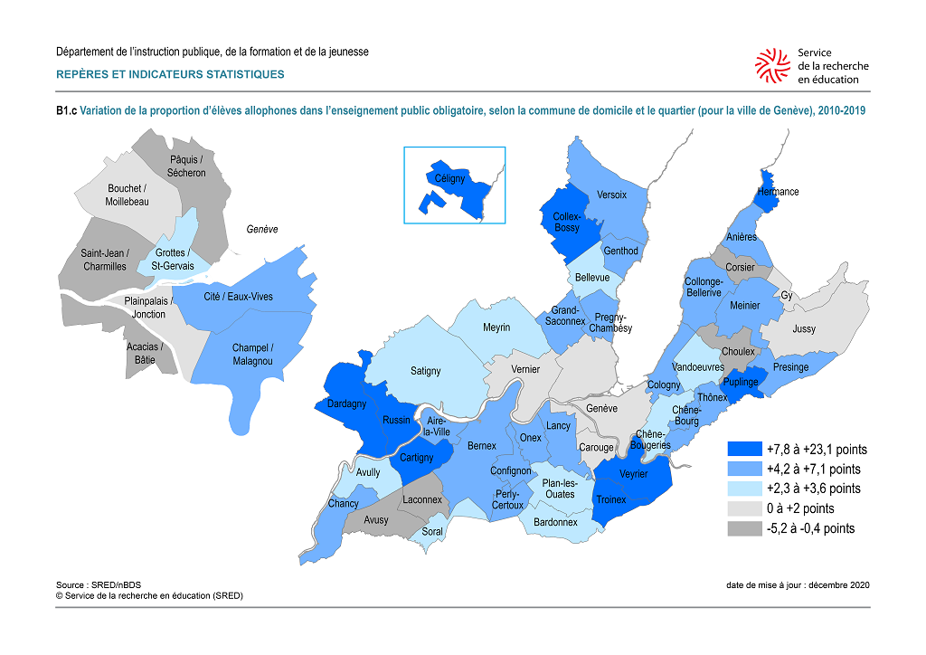 Repères et indicateurs statistiques - Carte B1.c - Variation de la proportion d’élèves allophones dans l'enseignement public obligatoire, selon la commune de domicile et le quartier (pour la Ville de Genève), 2010-2016
