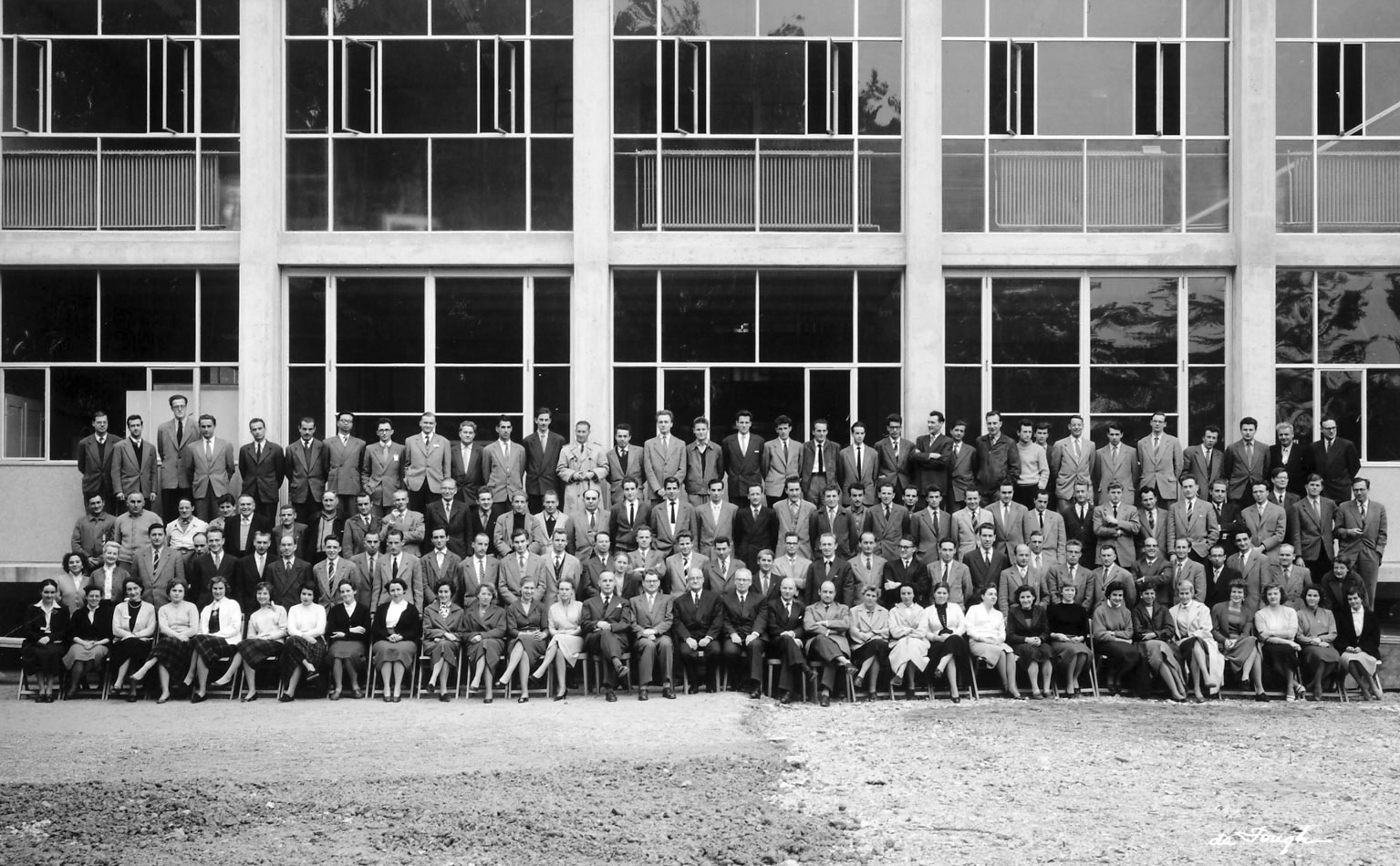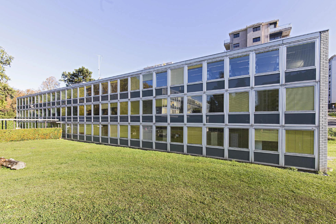Dès 1953, l’architecte Georges Addor conçoit un plan d’ensemble inspiré du modèle du campus américain, organisé selon une trame orthogonale. Il réalise successivement plusieurs édifices : les bâtiments B (1953-1954) et C (1957-1958), puis le bâtiment A (1960-1962), conçu comme un centre polyvalent regroupant laboratoires, bureaux, bibliothèque, cafétéria et salles de conférence. Ce dernier représente en outre le passage, chez Addor, d’une architecture en maçonnerie exaltant la structure à des volumes lisses habillés d’une peau de verre (mur-rideau). Le bâtiment D (1966-1969), plus modeste et destiné aux bureaux, complète cet ensemble cohérent. Enfin, le dernier grand édifice, le bâtiment F (1970-1972), réalisé par les architectes Dominique Julliard et Jacques Bolliger - qui reprennent le bureau après le départ de Georges Addor - se distingue par ses façades structurées par une puissante grille extérieure en béton armé assurant le rôle de brise-soleil.