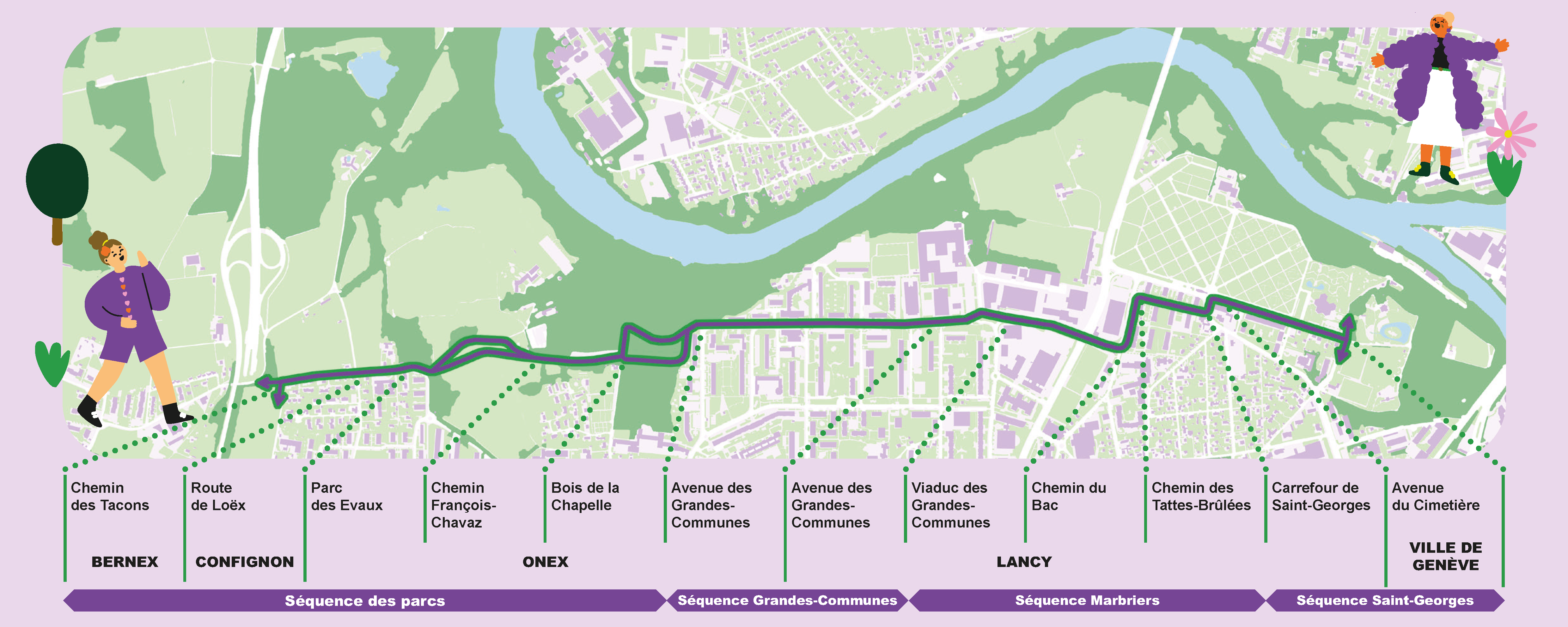 À terme, la future Voie verte Genève-Bernex traversera cinq communes sur 5 kilomètres, allant de Bernex jusqu'au Bois de la Bâtie à Genève, en passant par Onex, Confignon et Lancy (parc des Molliets, parc des Evaux, bois de la Chapelle, avenue des Grandes-Communes, quartier des Marbriers, avenue du Cimetière).