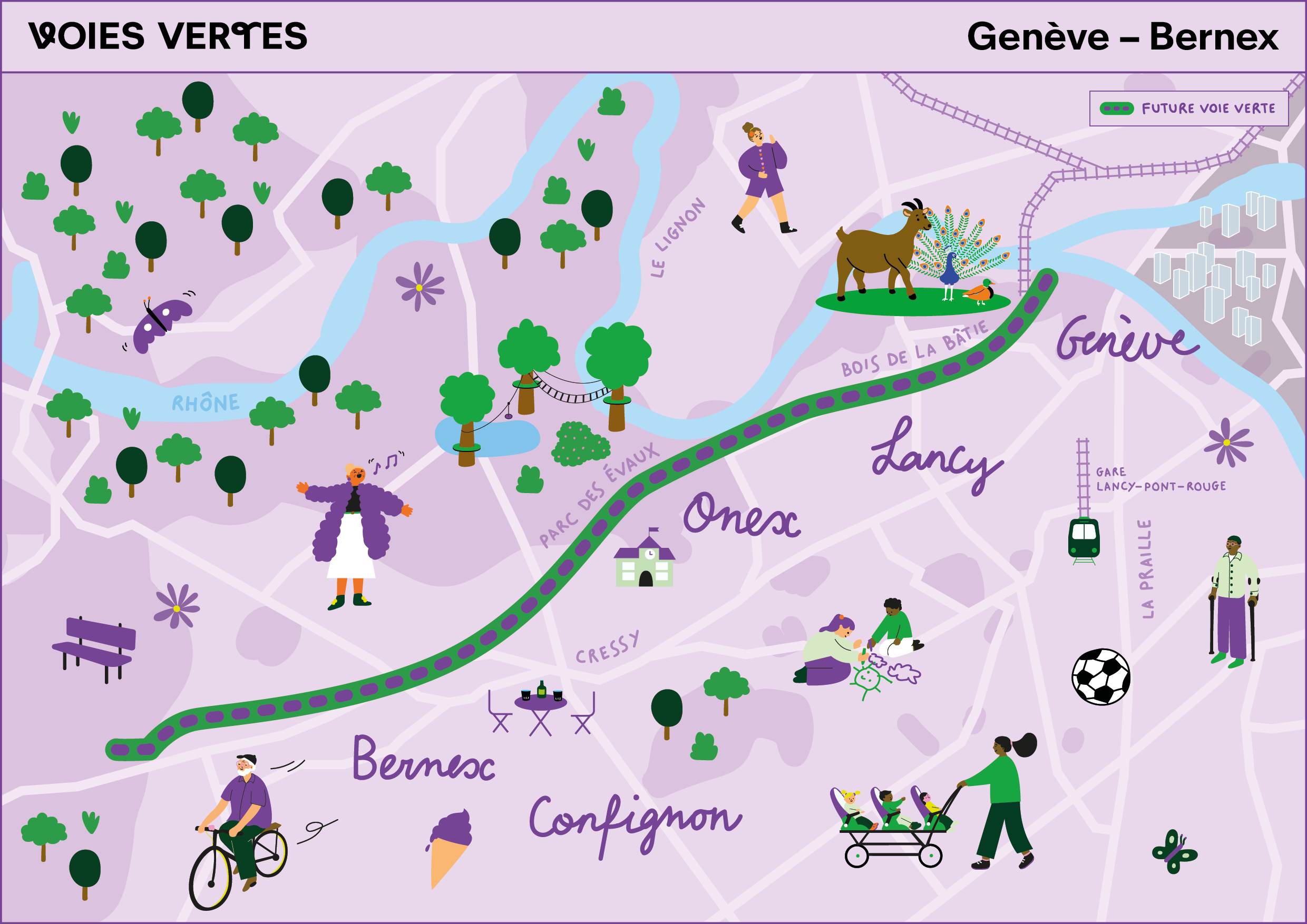 L'itinéraire offrira des déplacements agréables, constituant une alternative aux transports motorisés individuels. Les cyclistes pourront accéder en toute sécurité au centre-ville depuis Bernex. Selon les sections, la voie verte sera aménagée comme une ligne de transport, un espace public ou un parc linéaire, visant à enrichir les usages et améliorer la qualité de vie des habitantes et habitants, tout en mettant en valeur l’environnement.